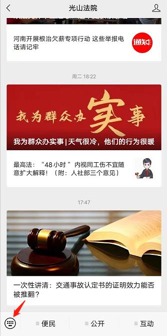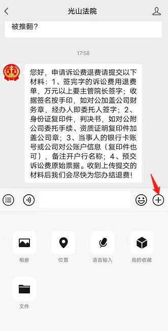 请您点击光山法院微信公众号下方最左侧图标后,点击“+”,拍照上传以上材料,收到上传提交的材料后我们会尽快为您办结退费!