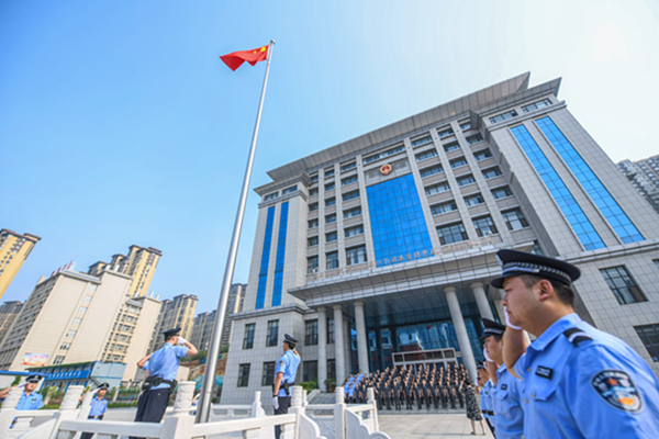 8点30分,升国旗仪式开始。由法警组成的国旗护卫队身着警服,迈着整齐划一的步伐护送国旗到达升旗台。随着庄严的国歌声奏起,全场肃立,国旗手奋力将鲜艳的五星红旗抛向空中,全体干警面向飘扬的五星红旗行注目礼,共同庆祝中国共产党成立101周年,共同祝福伟大的祖国繁荣昌盛。