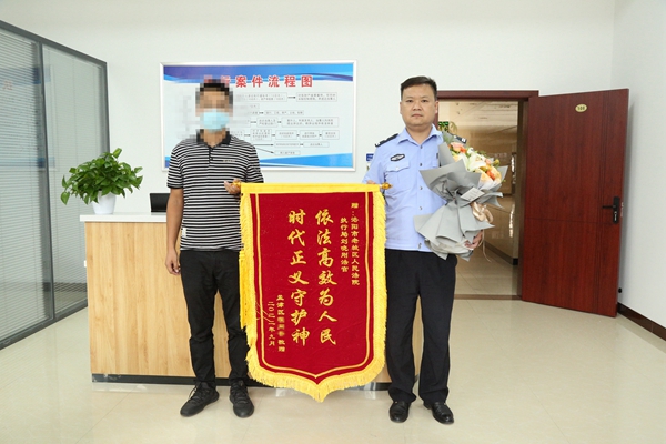 在案件圆满解决后,申请人程某被刘晓刚高效的执行作风所感动,特地送来鲜花和锦旗,并由衷说道:“你雷厉风行的执行方式,真的让我很感动。”