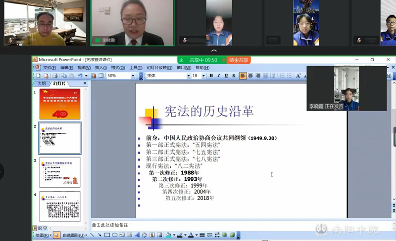 值此疫情防控的特殊时期,为迎接“12.4”国家宪法日,河南省南阳市中级人民法院发扬创新精神,将宪法宣传活动开到了学校的“云”上课堂。12月3日下午,行政庭法官李晓霞来到南阳市第三中学八年级的“云”上课堂,以“学习宣传贯彻党的二十大精神 推动全面贯彻实施宪法”为主题,以通俗易懂的语言,深入浅出地向学生们讲述了法治国家、法治社会和法治校园的目标任务,并生动地讲授了宪法的地位、历史沿革、基本内容等知识,帮助学生们了解宪法,引导大家树立维护宪法权威、遵守宪法法律的意识。南阳市第三中学校八年级共200余名师生参与了这场别开生面的“云”上宪法课。