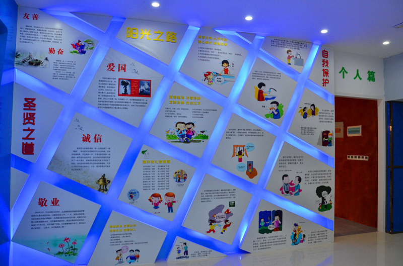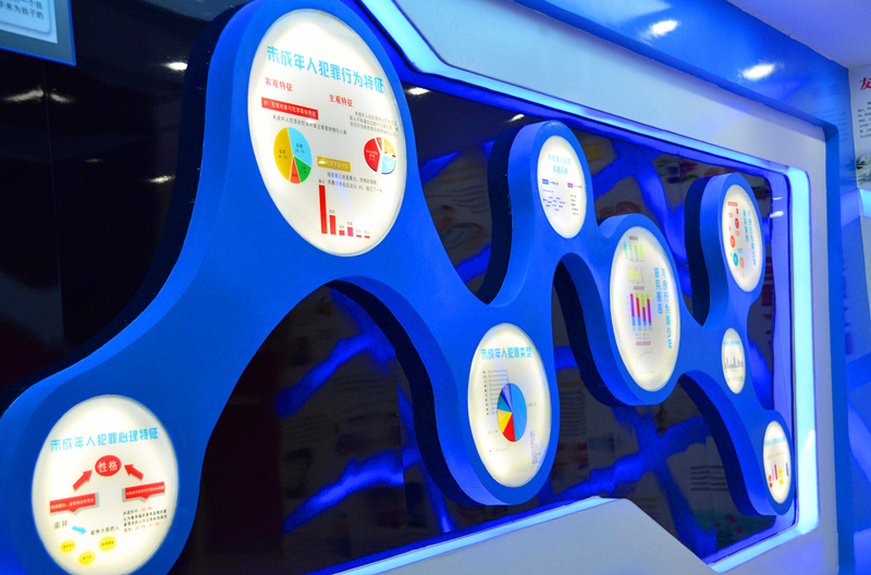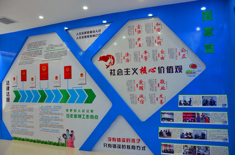 该法院青少年法制教育中心以24字社会主义核心价值观展开分为国家篇、社会篇和个人篇,分别从不同层面融青少年的知法、守法、用法、护法教育为一体,深入浅出地阐述了青少年所必备的基本法律知识和为人处世的道理。富强、民主、文明、和谐是国家层面的价值目标。国家篇主要布展了经典文章《少年中国说》、不同时期主要国家领导人对青少年关怀的图文以及当前国际国内对青少年保护的现状和少年审判工作情况等;