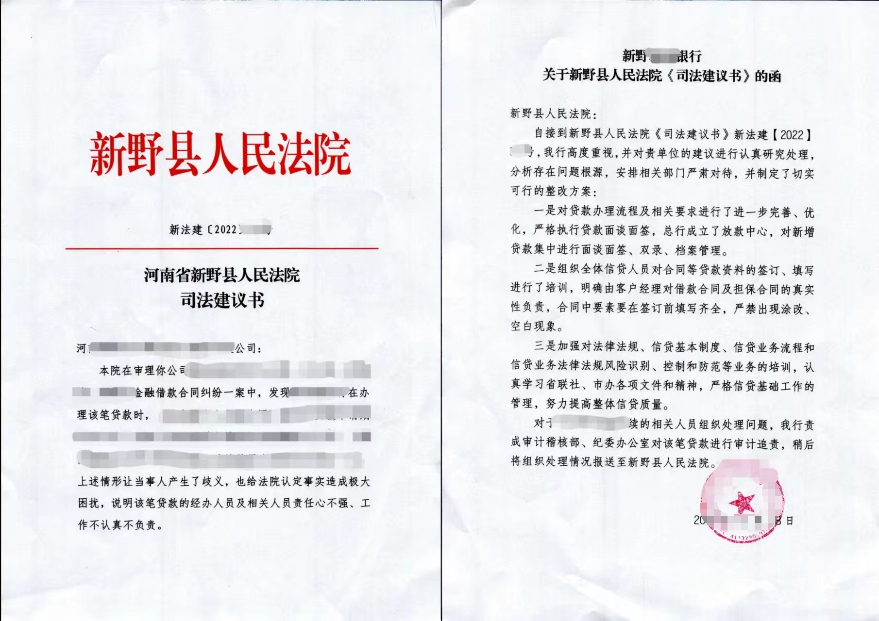 该行在收到法院司法建议后,及时向法院作出反馈并通过以下三个方面严抓落实:一是严格执行贷款面谈面签,在总行成立放款中心,对新增贷款集中管理;二是加强对全体信贷人员培训学习,努力提高整体信贷质量;三是组织审计稽核部、纪委办公室开展内部调查,严肃处理违规违纪人员。