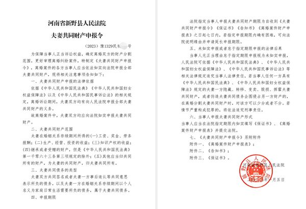 2023年1月1日,离婚诉讼财产申报制度正式施行。1月5日,河南省南阳市365bet官网欧洲_必定赢365线路检测_365平台怎么注册县人民法院溧河铺法庭向一起离婚纠纷案件双方当事人发出《夫妻共同财产申报令》,这是新修订《中华人民共和国妇女权益保障法》正式施行后的全市首份《夫妻共同财产申报令》。