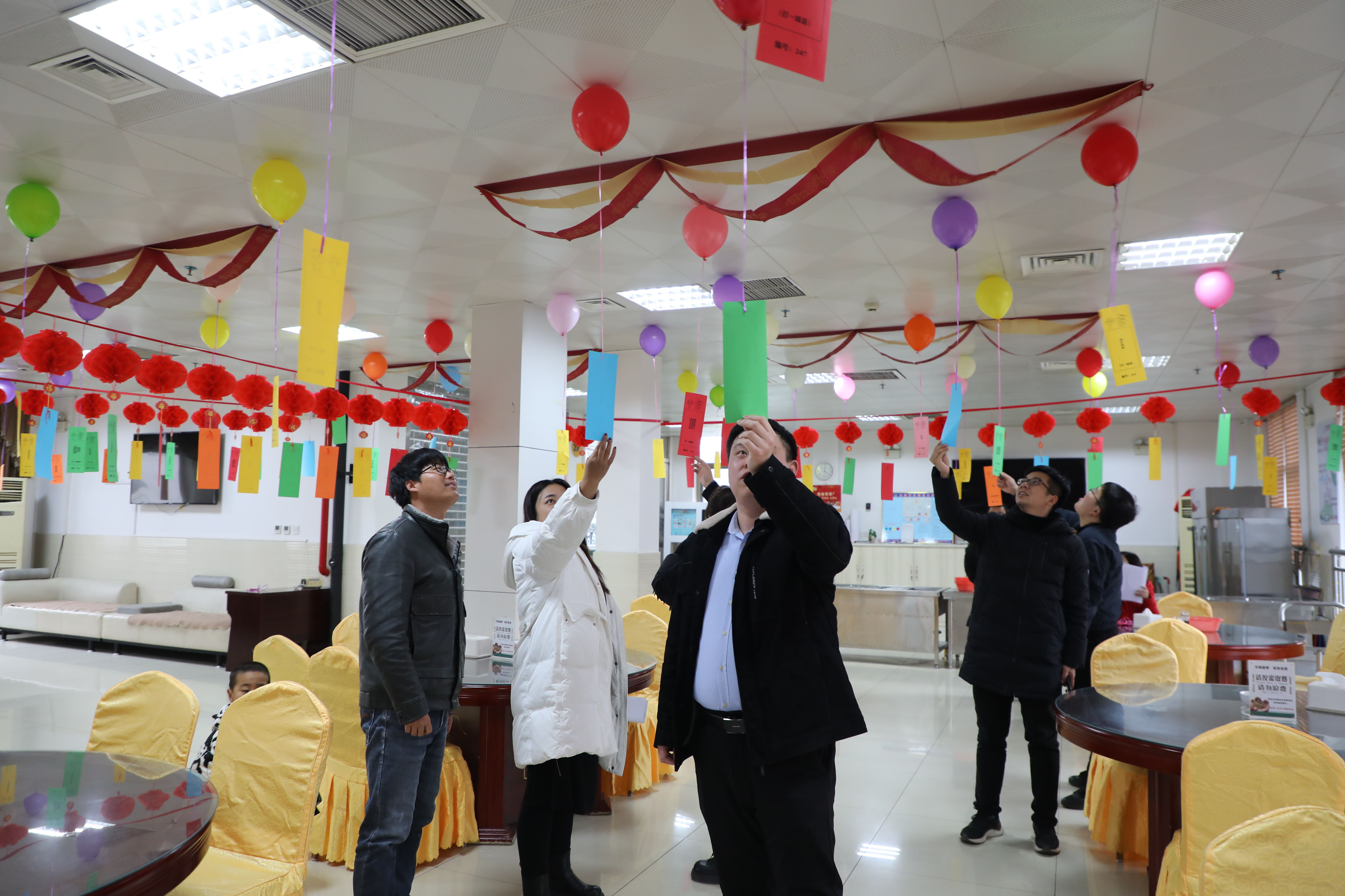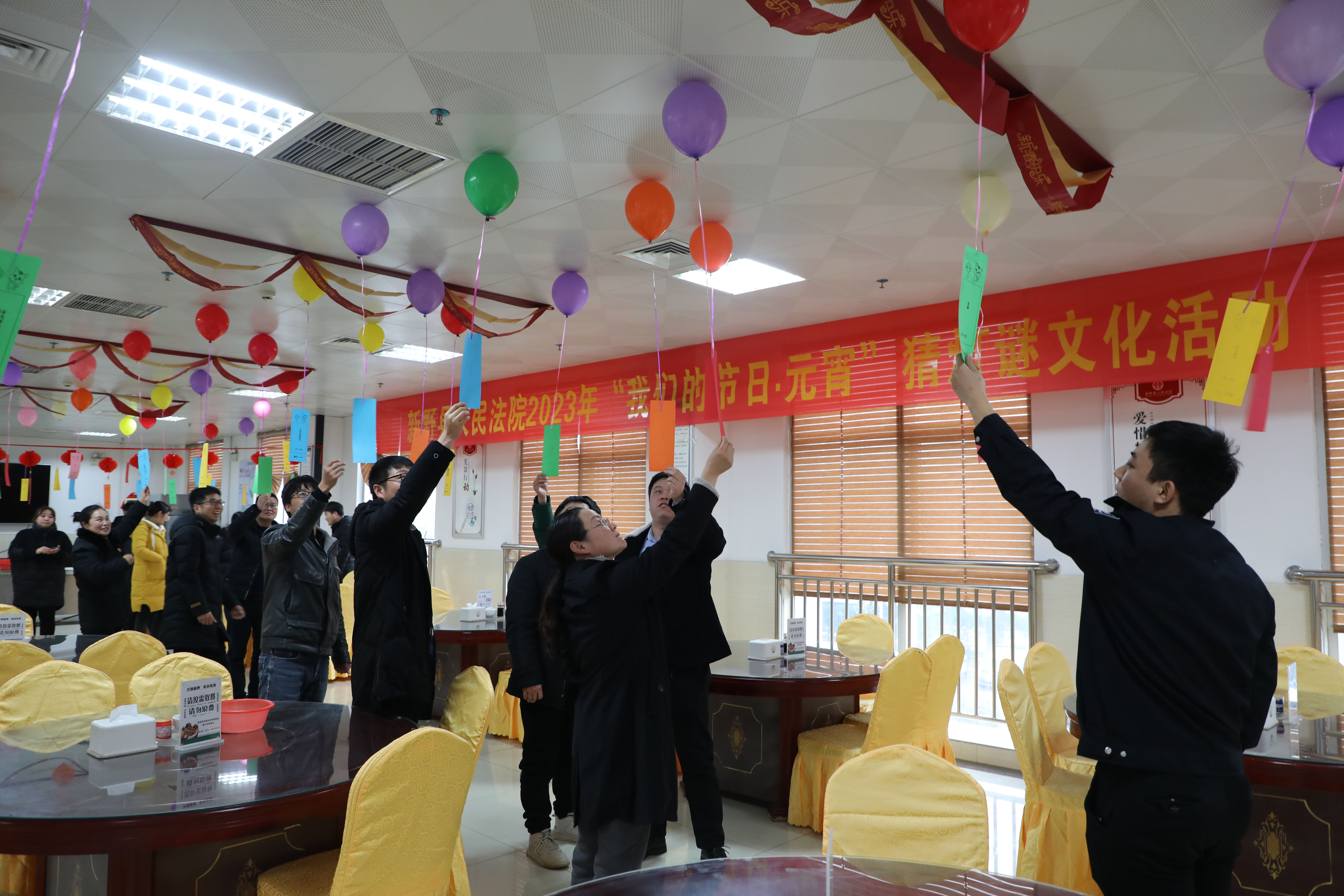 365bet官网欧洲“已是悬崖百丈冰,犹有花枝俏——打一党史人物”……五颜六色的谜面纸条映衬下,大红灯笼、五彩气球悬挂,喜庆氛围扑面而来。此次活动为干警准备了200余条谜语,谜面、谜底的种类众多,涵盖了党史、文学历史、诗词谚语、科普知识、现代生活等,既有通俗易懂的趣味猜题,也有较为复杂的抽象谜题,集知识性、趣味性、娱乐性为一体。活动现场欢声笑语、气氛热烈,使全院干警在紧张的工作之余放松了心情,感受到元宵节独特的民俗文化,丰富了精神文化生活,提升了法院队伍的凝聚力和向心力。