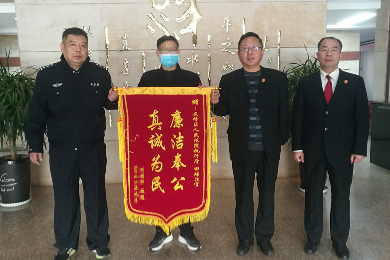11月8日上午,申请人陈某的儿子将一面印有“廉洁奉公 真诚为民”的锦旗送至安阳市文峰区人民法院执行局,感谢执行干警田玮耐心细致调解,成功将执行案款一次性执行到位。