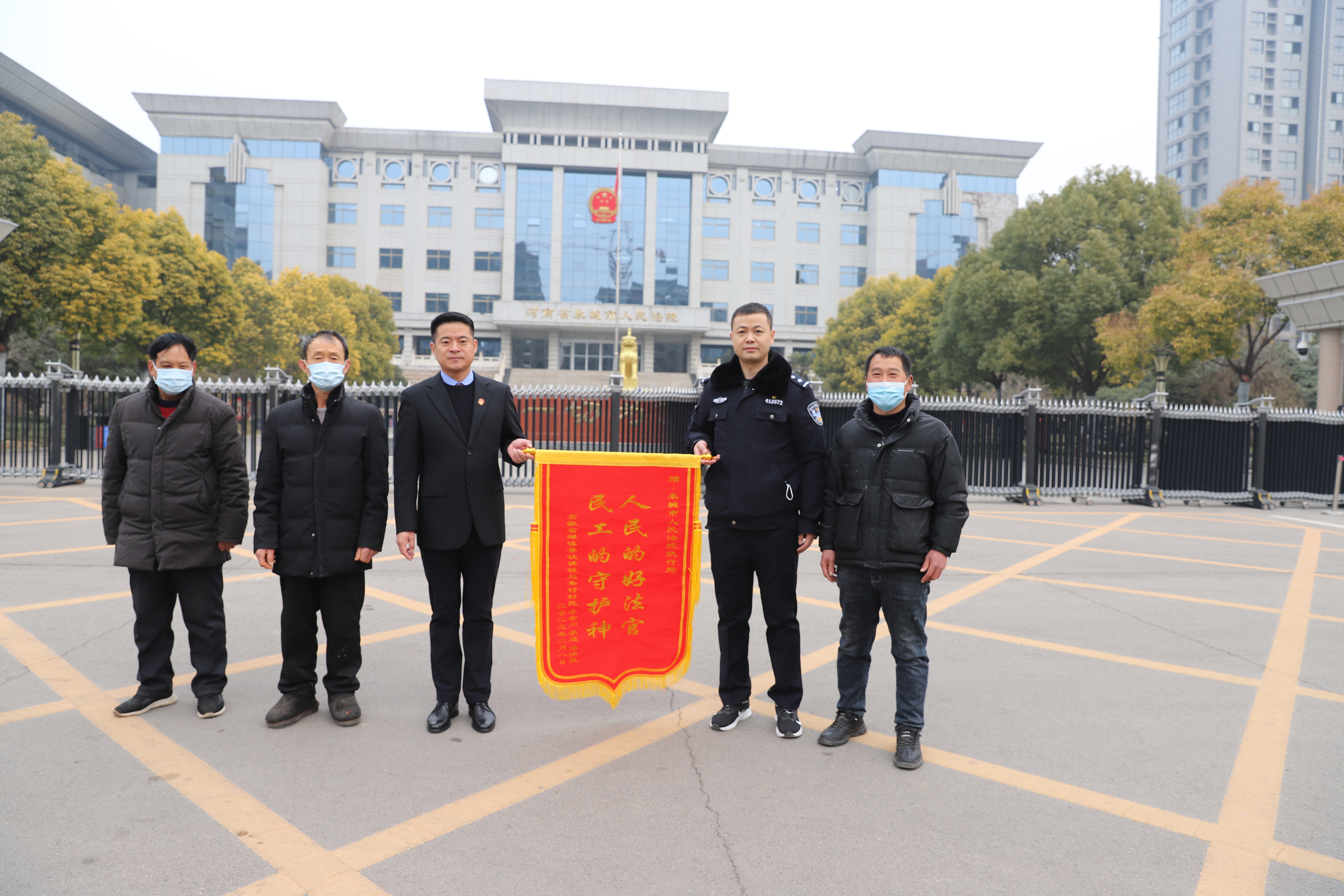 2月8日,三名农民工向永城法院执行局送来一面“人民的好法官,民工的守护神”的锦旗。